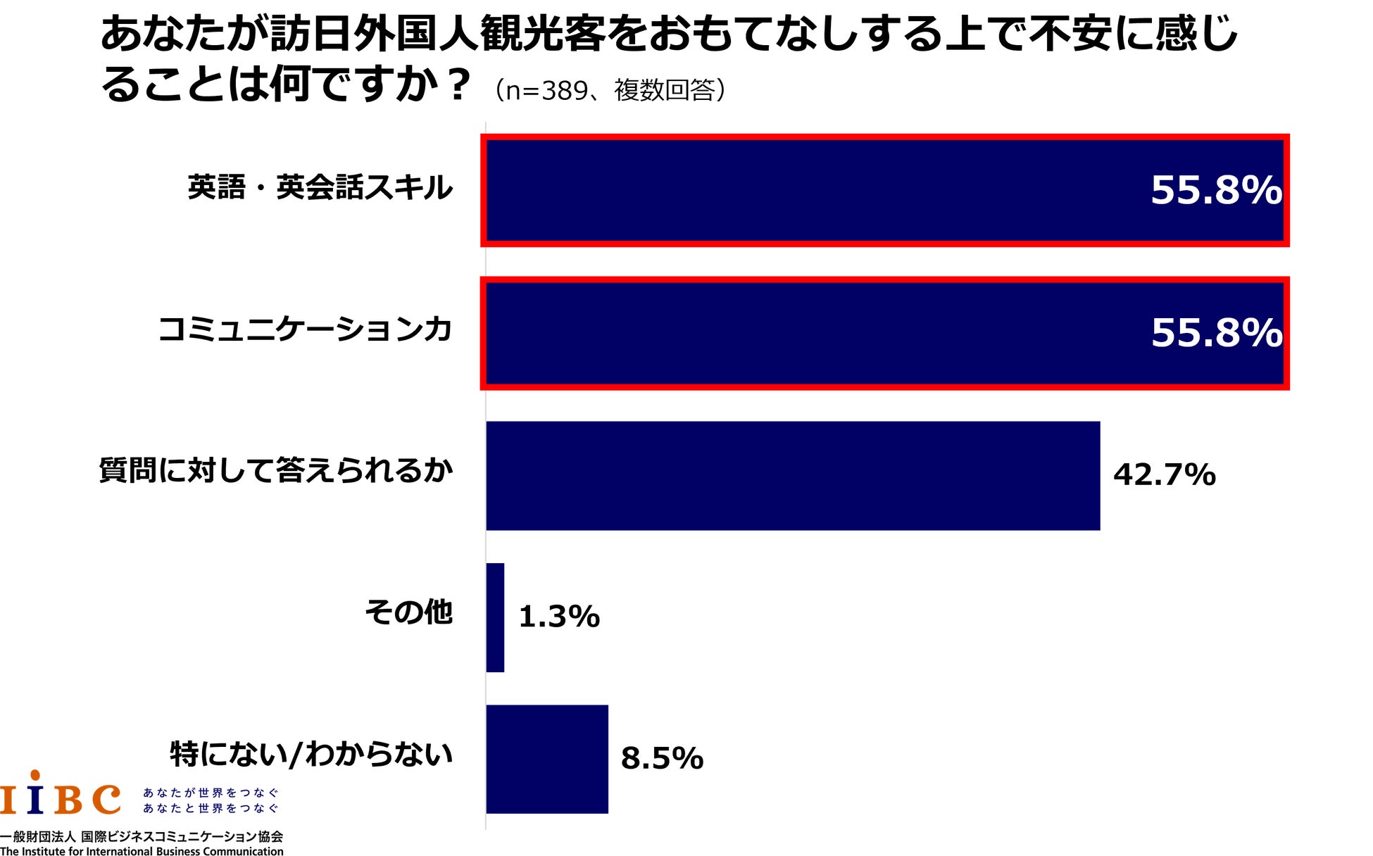 さらに、おもてなしをする上で不安に感じていることの中で最も多かったのは「英語・英会話スキル」(55.8%)、「コミュニケーション力」(55.8%)という結果になり、英語・英会話のスキルに対して不安を感じている人が多いことがわかりました。