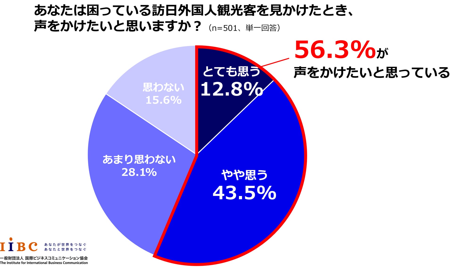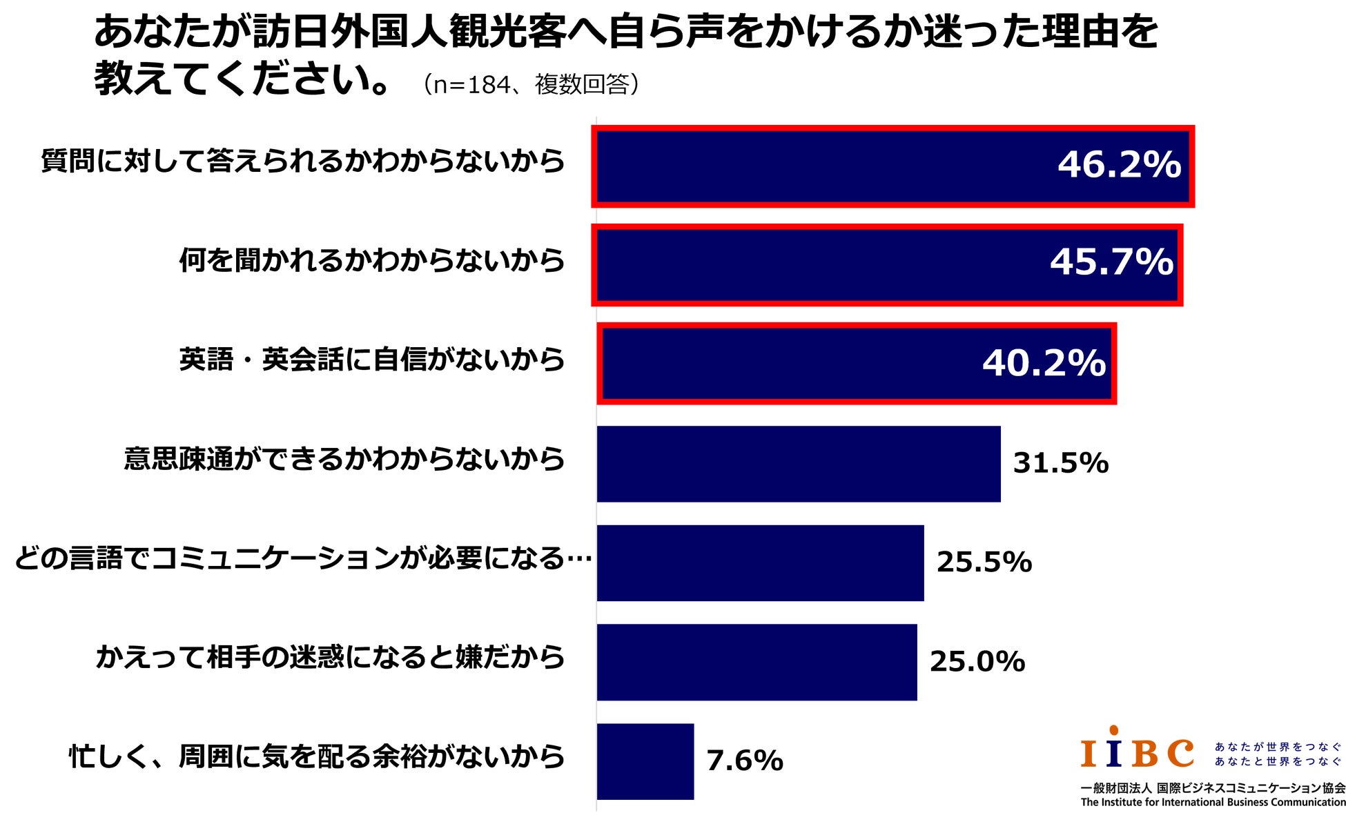 声をかけるか迷った理由としては、「質問に対して答えられるかわからないから」(46.2%)、「何を聞かれるかわからないから」(45.7%)、「英語・英会話に自信がないから」(40.2%)となり、困りごとに対して自分が答えられるかどうか、不安に思っている人が多いようです。