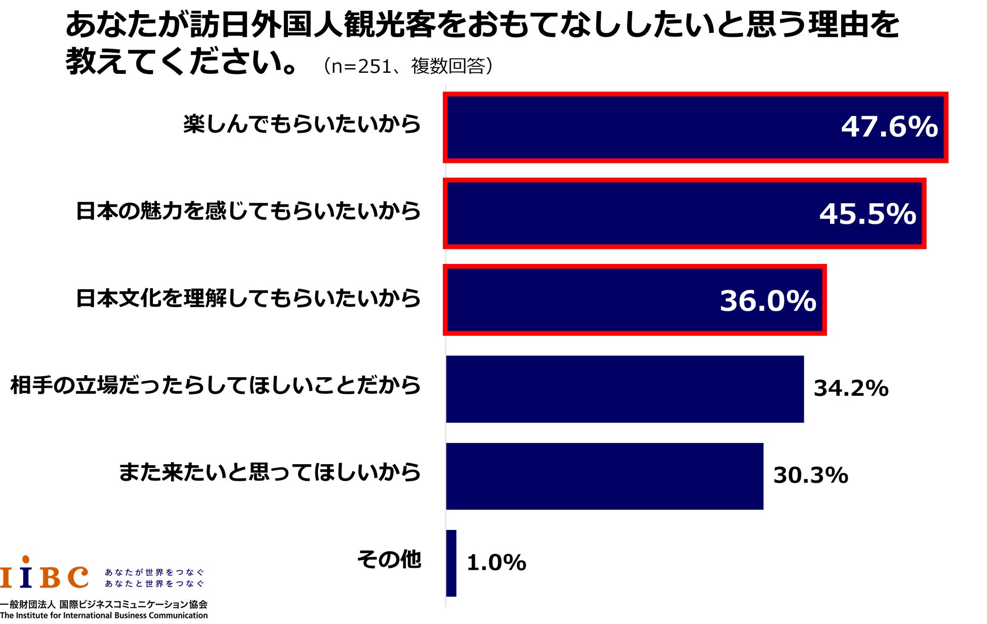 訪日外国人観光客へのおもてなしに関する意向を聞いてみると、77.6%が訪日外国人観光客をおもてなししたいと思っていることが明らかになりました。その理由として最も多かったのは「楽しんでもらいたいから」(47.6%)、2位は「日本の魅力を感じてもらいたいから」(45.5%)、3位は「日本文化を理解してもらいたいから」(36.0%)となっており、訪日外国人観光客を思いやり気遣う、おもてなし精神が感じられる結果となりました。