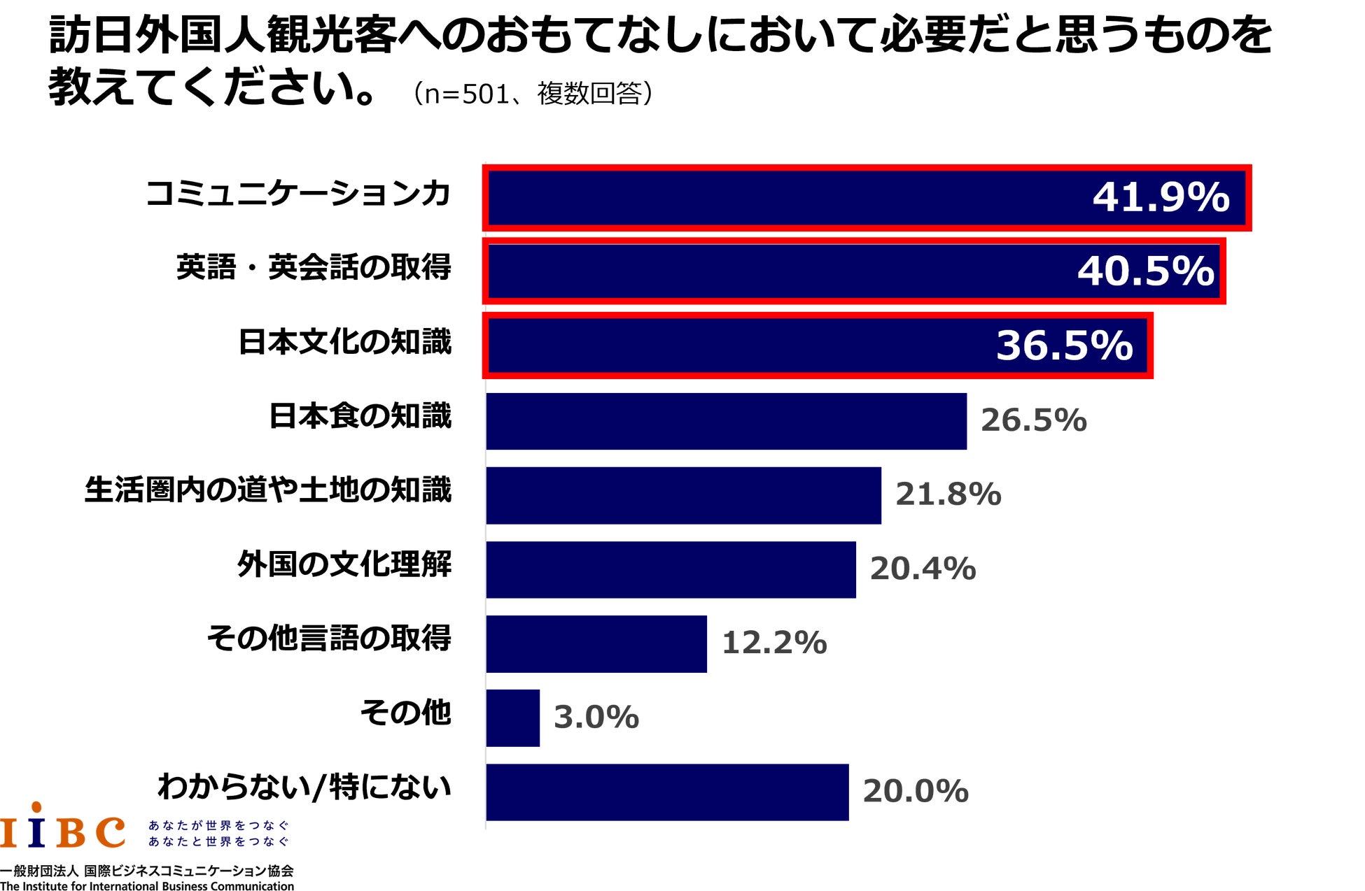 訪日外国人観光客へのおもてなしにおいて必要だと思うことを聞いてみると、1位は「コミュニケーション力」(41.9%)、2位は「英語・英会話の取得」(40.5%)、3位は「日本文化の知識」(36.5%)という結果になりました。