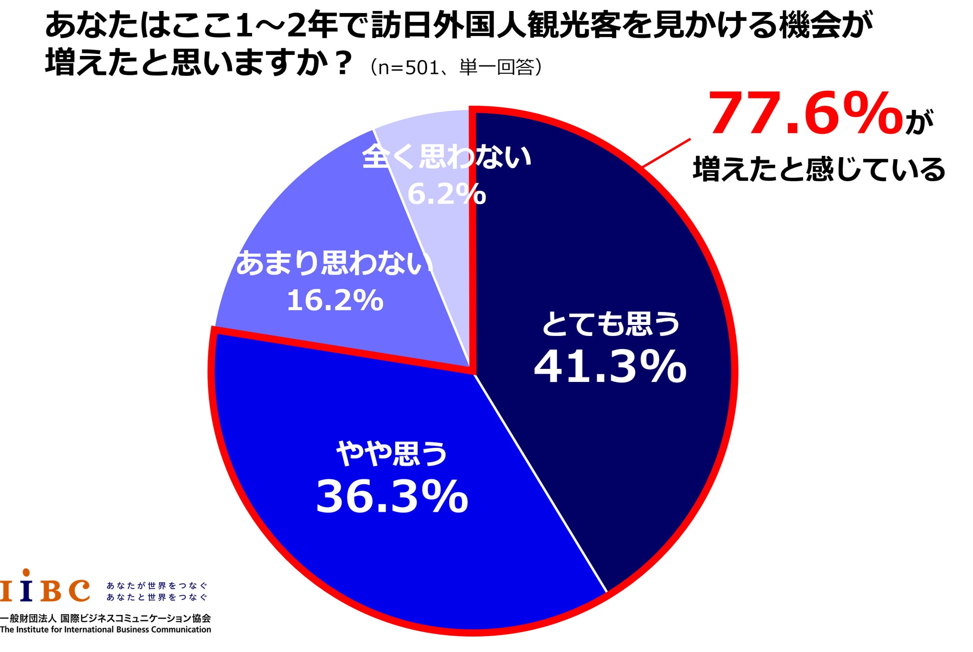 訪日外国人観光客を見かける機会について聞いてみると、77.6%がここ1~2年で訪日外国人観光客を見かける機会が増えたと回答しており、インバウンドの増加を実感している人が多いことがわかります。