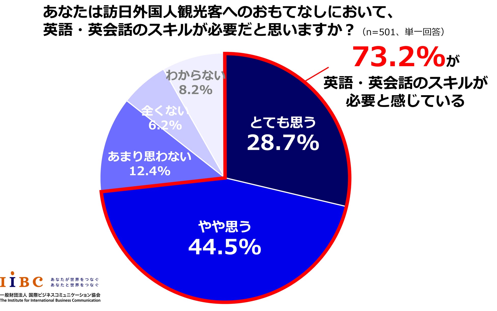 また、73.2%が訪日外国人観光客へのおもてなしにおいて英語・英会話のスキルが必要だと思うと回答しており、多くの人がおもてなしには英語・英会話のスキルが欠かせないと思っていることがわかります。