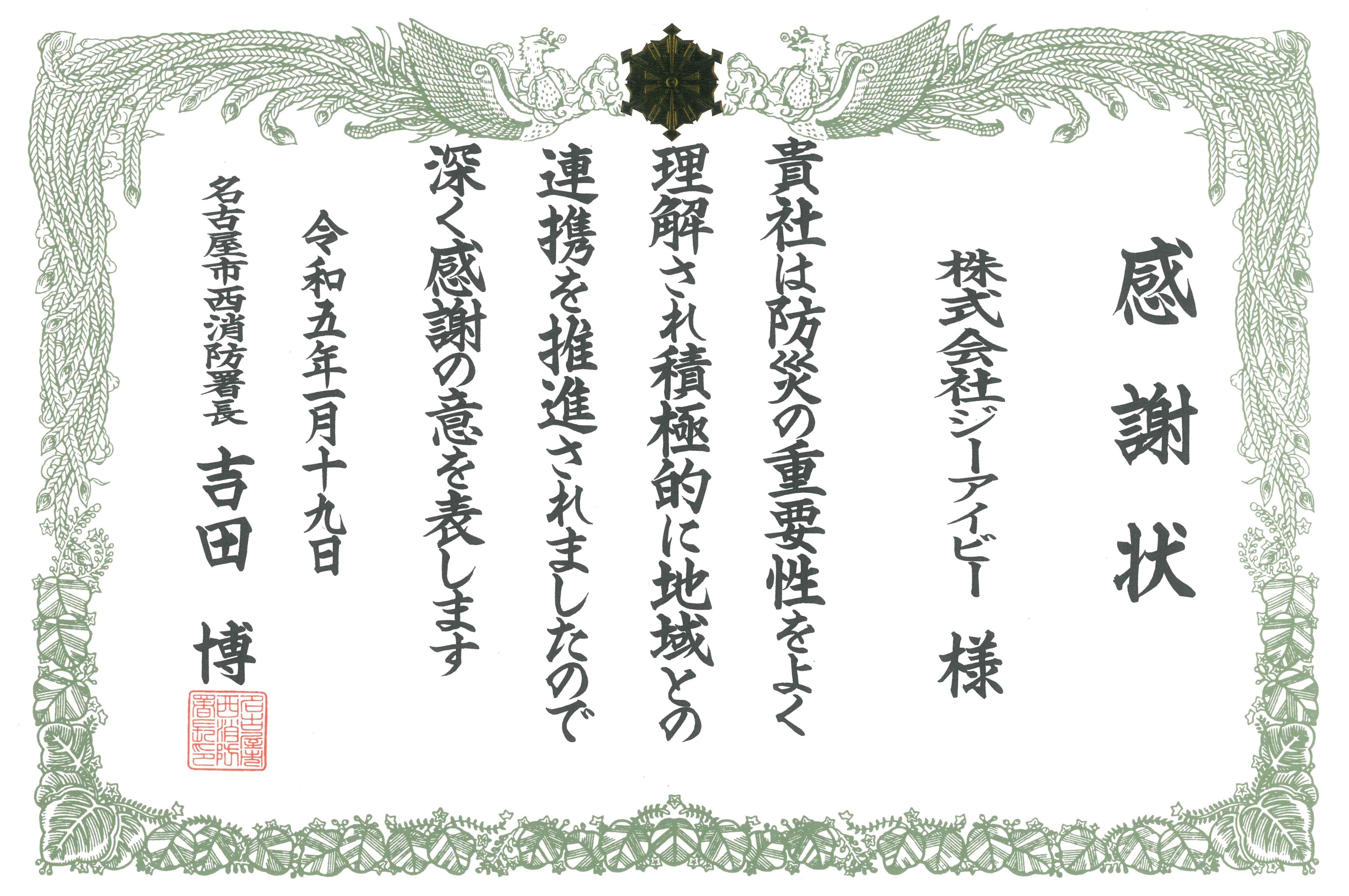 株式会社ジーアイビー 名古屋市西区消防表彰式にて、西消防署より感謝状を授与