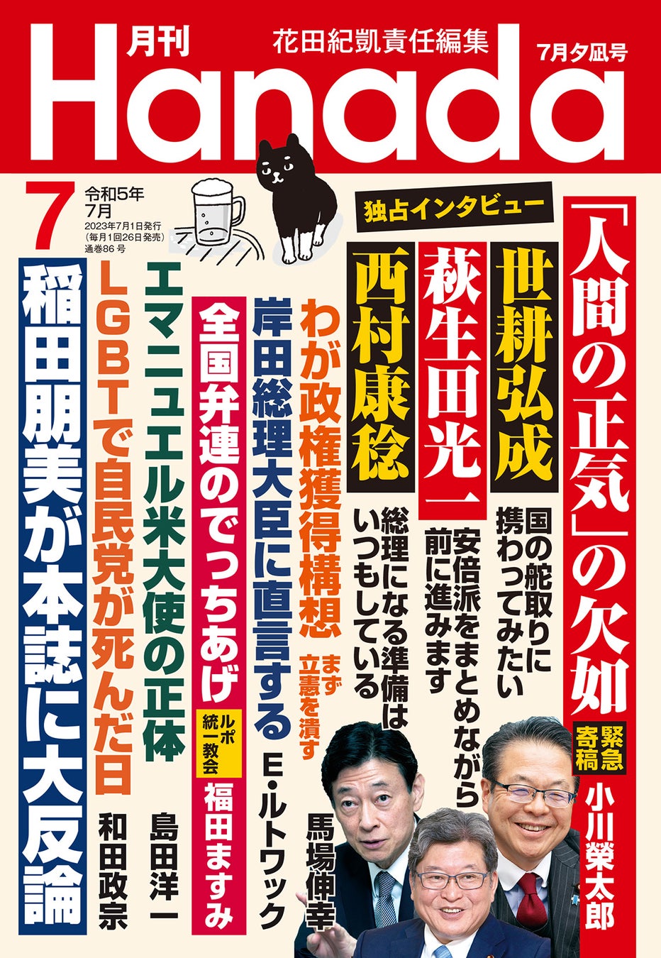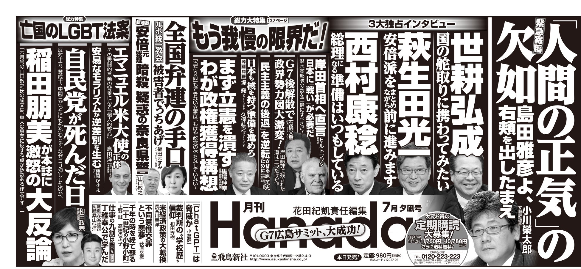 5月26日発売の月刊『Hanada』7月号(飛鳥新社刊)に3大独占インタビューが掲載された。