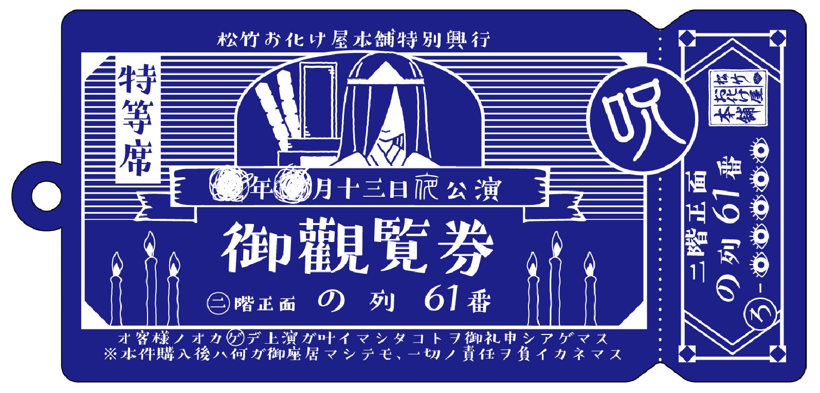 本イベント開催に合わせて、松竹お化け屋本舗初となるオリジナルグッズの販売を開始いたします。公演チケットをモチーフとしたカラーアクリルキーホルダーは、歌舞伎や演劇の興行で長い歴史を積み重ねてきた松竹ならではのデザイン。レトロポップさを基調としつつも、ホラーブランドとしてのこだわりを細部にまで散りばめています。数量限定となりますので、貴重な機会をお見逃しなく!