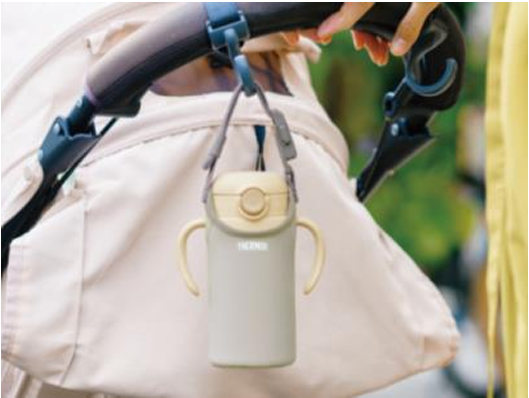 また、「専用のポーチがほしい」「落としたときに衝撃から守りたい」などのご要望を受け、『サーモス ストローマグポーチ(APK-350)』も新発売。バックル付きでベビーカーやバッグに取り付けられる専用ポーチです。