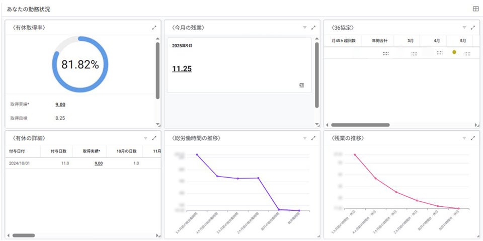 社員は自身の勤務状況をタイムリーに把握することで、社員が主体的に業務をコントロールでき、生産性向上とワークライフバランスの実現につながっています。また、マネージャーはチームの勤務状況を把握し、業務分担の見直しや有休取得のフォローなど、チームでの働き方を検討する指針として活用しています。