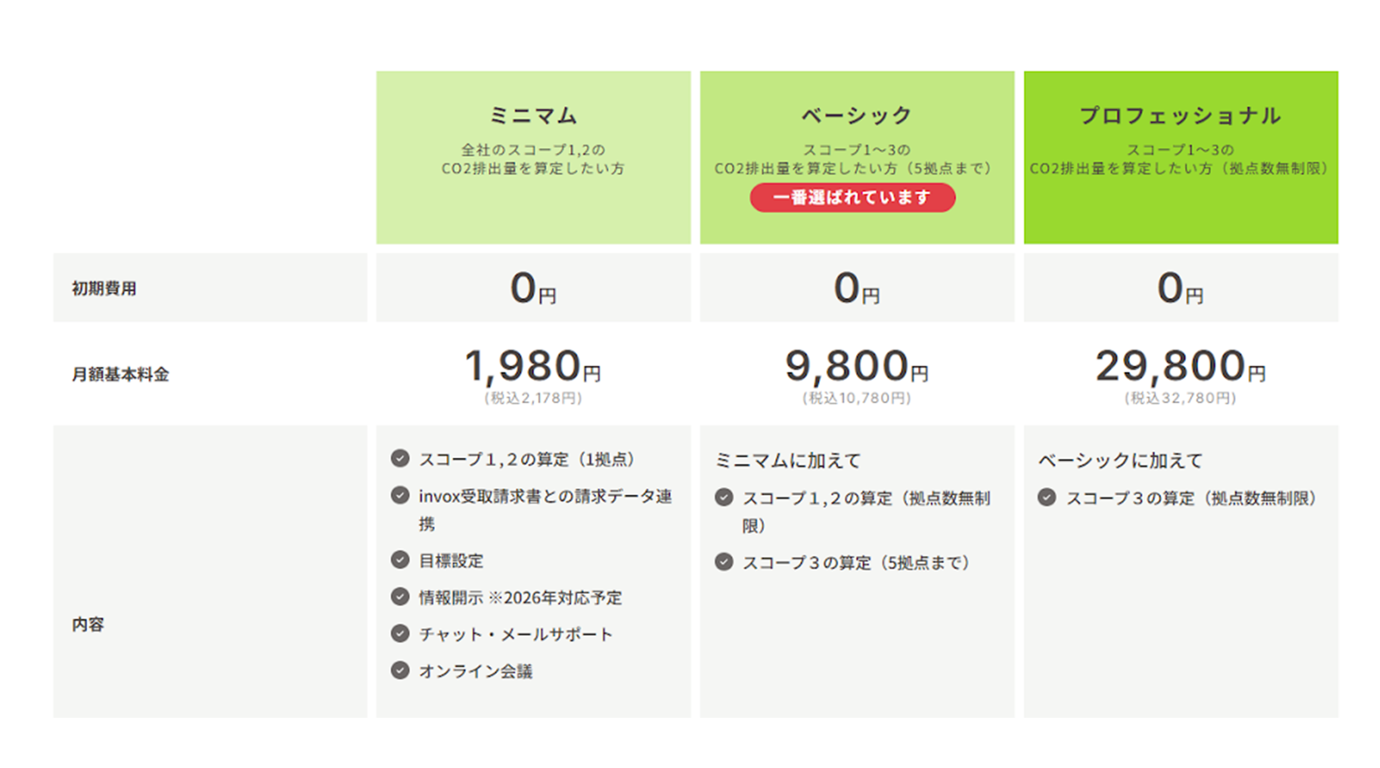 本機能の提供開始に伴い、スコープ1、2のCO2排出量を算定したい方向けの「ミニマムプラン」、スコープ3まで算定し目標設定や削減に取り組みたい方向けの「ベーシックプラン」に加え、スコープ3までのCO2排出量を拠点数の制限なく算定したい方向けの「プロフェッショナルプラン」の提供を開始しました。