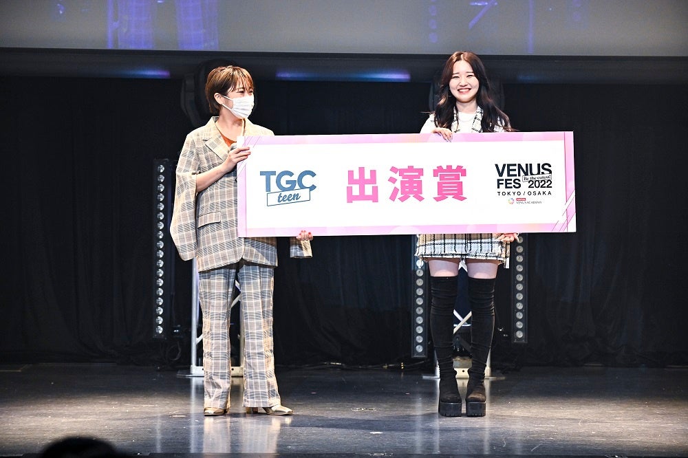 イベント最後には、モデルとしてステージに登場したメンバーの中から誌面デビュー及びファッションショーへの出場権が得られる学内モデルオーディションの結果を発表。ヴィーナスアカデミータイアップページのモデルとして雑誌Jellyの誌面デビューを獲得したのはトータルビューティ基礎科の鈴木ユミさんと高等部 ヘアメイク専攻の櫻井佳乃さん、“令和teen”のためのガールズフェスタ「TGC teen 2022」の出演権を得たのはインフルエンサー基礎科の芹澤陽菜さん。それぞれ、プロのモデルとしての夢に向かって一歩前進しました。