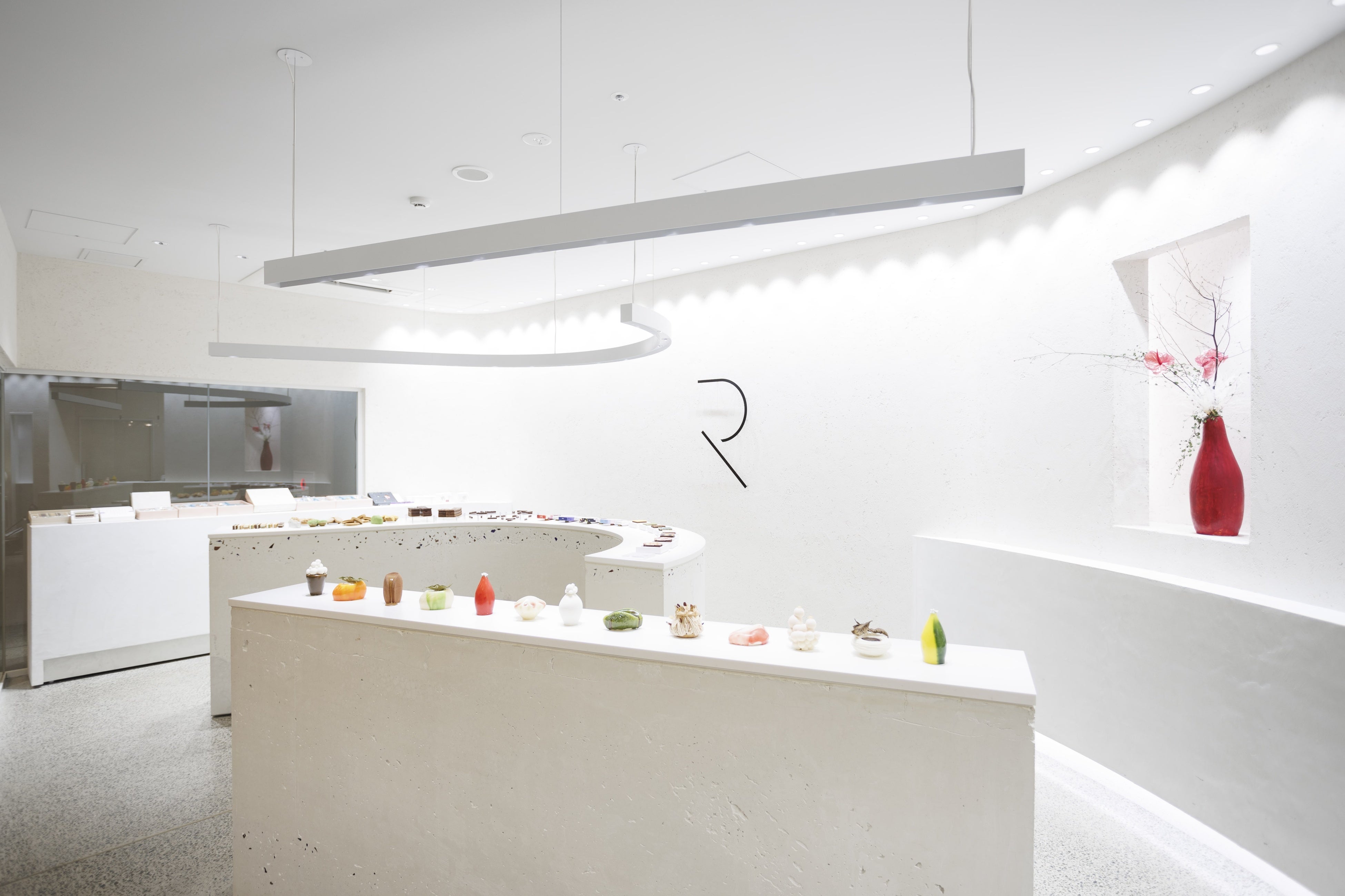 「RAU」のスイーツをお楽しみいただけるカフェスペース。印象的なフォルムの生菓子「デセール」や、香り成分をテーマにしたジェラート、焼き菓子などをお楽しみいただけます。