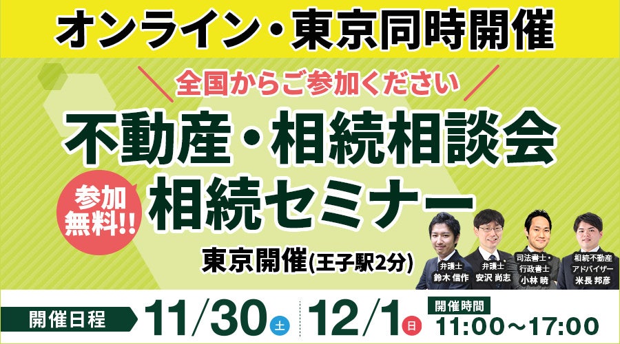 【東京・オンライン同時開催】北区王子駅にて「不動産・相続相談会/相続セミナー」を11月30日(土)・12月1日(日)に参加費無料で開催