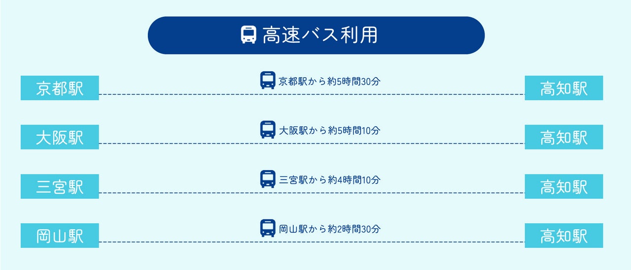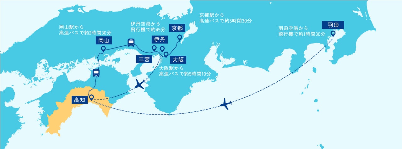 本州から高知県までは飛行機や鉄道、高速バスでアクセス可能。