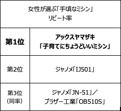 2021年12月〜1月実施の調査において女性が選ぶ「手頃なミシン(※)」利用率第1位は「ブラザー工業 PS202/PS203」、総合満足度第1位は「ジャノメ JN508DX」、リピート率第1位は「アックスヤマザキ 子育てにちょうどいいミシン」となりました。(※ランキングは1〜2万円台のミシンを調査対象にしたもの)