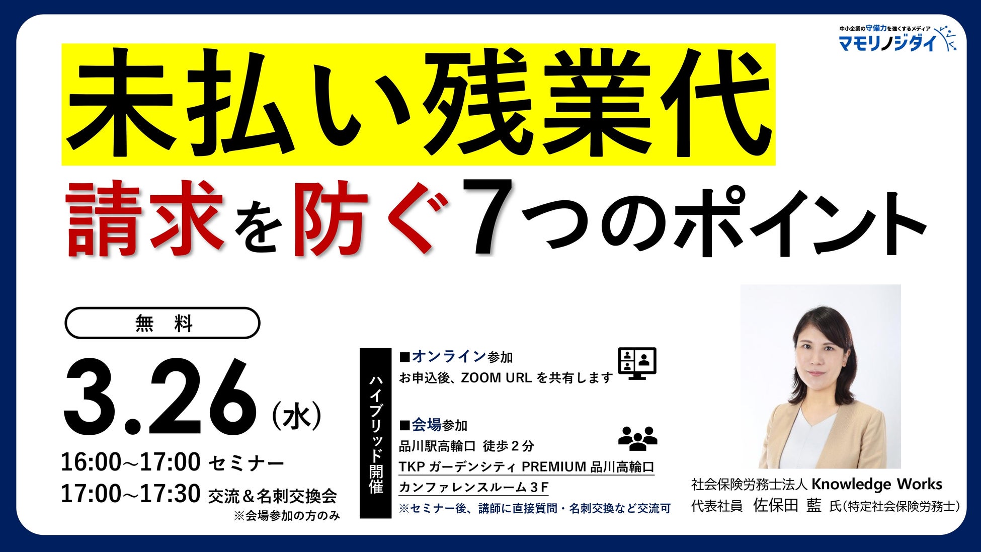 中小企業の守備力を強くするメディア『マモリノジダイ』を運営する株式会社スリーエーコンサルティング(代表取締役社長:竹嶋 寛人)は、3/26(水)16:00より労務リスク対策特別セミナー「未払い残業代の請求を防ぐ7つのポイント」を開催します。