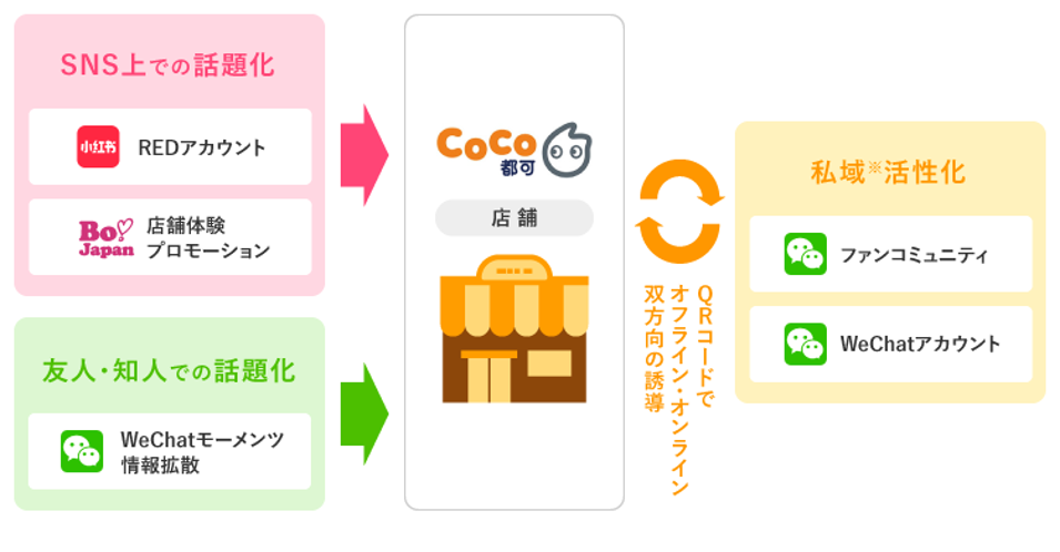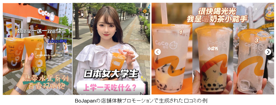 そのような中、在日中国人をメインとした来店者数および売上増加に繋げるため、2021年12月より当社が複数の中国SNSアカウントの立ち上げ、ファンコミュニティの立ち上げ・運営、独自に構築する日本最大級の在日中国人コミュニティ「BoJapan(ボージャパン、以下BoJapan)」を活用した店舗体験プロモーション、WeChatモーメンツ(※1)への情報拡散など複数の中国SNSを活用した複合施策を実施しています。この結果、2022年2月には中国SNS上および友人・知人での話題化や私域(※2)の活性化により、中国SNS経由で総来店者数の約20%を超える店舗送客を実現(※3)しました。