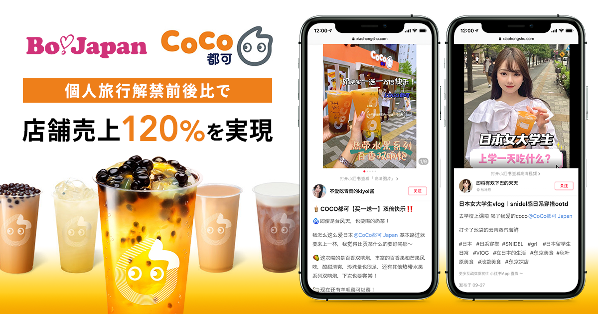 企業のマーケティングDXを支援するアライドアーキテクツ株式会社(東京都渋谷区、代表取締役社長 CEO:中村壮秀、証券コード:6081)で中国進出支援事業を展開するクロスボーダーカンパニー(カンパニープレジデント:番匠達也)は、株式会社Tastea Trustea Japan(東京都渋谷区、 代表取締役:齋藤 香緒里)が運営するグローバルバブルティーブランド「CoCo都可(ココトカ)」に対して、2021年12月より在日中国人と複数の中国SNSを活用した複合施策を行っておりますが、この度、個人旅行解禁前後30日間の店舗売上比較で渋谷本店が120%、日本国内全6店舗の合計でも105%の売上を実現しましたのでお知らせいたします。