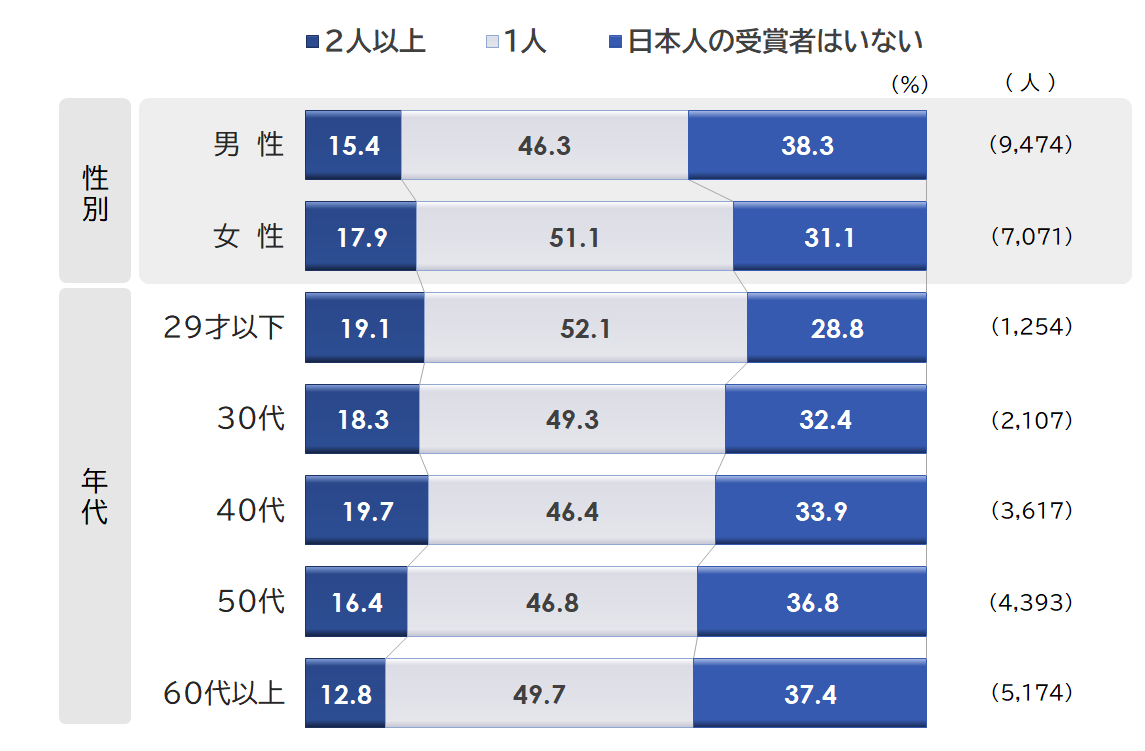 男女ともほぼ半数の方が受賞者は「1人」と回答されており、最も多い予想となっていますが、「日本人の受賞者はいない」も男性では4割弱となっており、女性に比べて僅かながら男性からの悲観的な予想が多い結果となりました。また「日本人の受賞者はいない」は年代が上の世代ほど多い傾向がみられ、前述のスパコンとは逆の傾向を示しています。