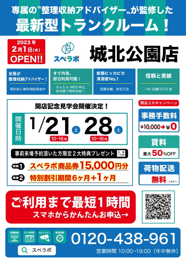 【城北公園通店/2月1日(水)オープン】見学から契約、解約まで完全非接触・非対面、お申し込みからご利用まで最短1時間!都内、大阪などにて絶賛運営中のトランクルーム【スペラボ】が城北公園通駅近くに出店!