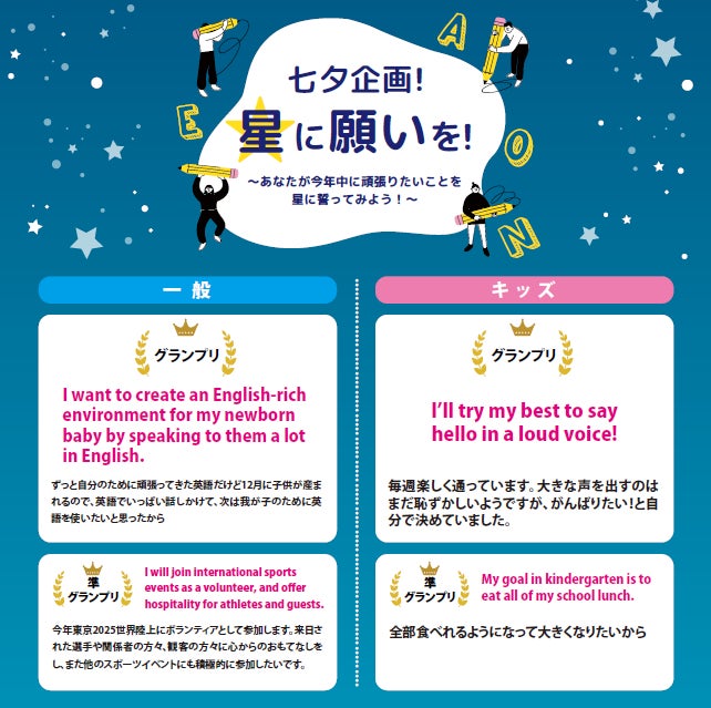 英会話教室を運営する株式会社イーオン(本社:東京都新宿区、代表取締役社長:重野卓、以下「イーオン」)は、イーオン、イーオンキッズにお通いの生徒様を対象に、2025年6月1日(日)~30日(月)の期間中、七夕にちなんで「今年頑張りたいこと」について英語で作成した一文を募集しました。応募総数は219件となり、皆様の様々な想いを綴ってくださいました。その中から一般(高校生以上)部門、キッズ部門それぞれにおいてグランプリ・準グランプリを決定しました。
