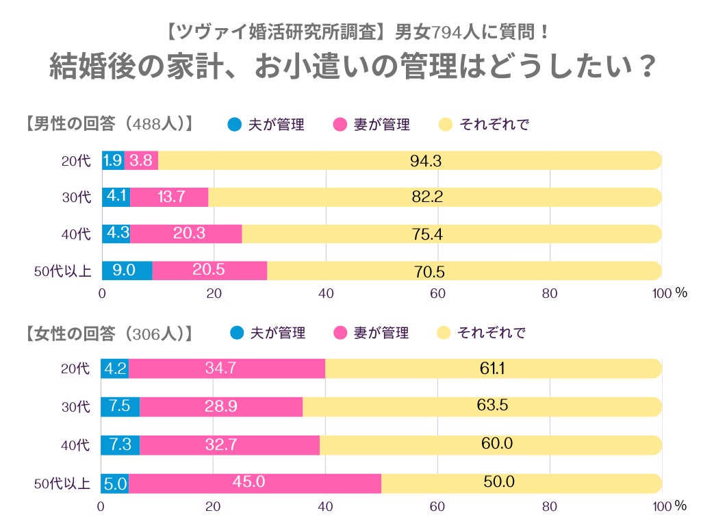 国内最多の成婚数を誇る株式会社IBJのグループ会社である株式会社ZWEI(本社:東京都中央区、代表取締役社長:中野 大助、以下「ZWEI(ツヴァイ)」)が運営する「ツヴァイ婚活研究所」は、全国の20歳以上の男女男女794名(男性488人/女性306人)に対して、「結婚後の家計管理」をテーマにした独自アンケート調査を実施。その結果、お小遣いや貯蓄ともに、夫婦の財布を完全に分ける「独立管理」が新常識になっていることがわかりました。