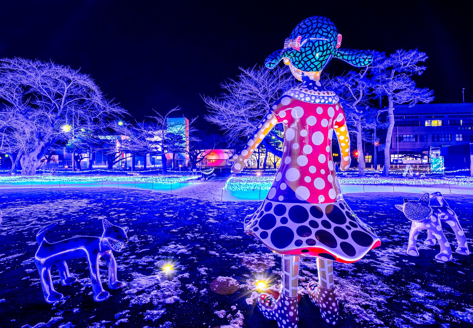 青色LEDが光のじゅうたんのようにアート広場全体を覆いつくし、幻想的な世界を演出します。光の中に浮かぶさまざまなアート作品の昼間とは違った表情をお楽しみください。