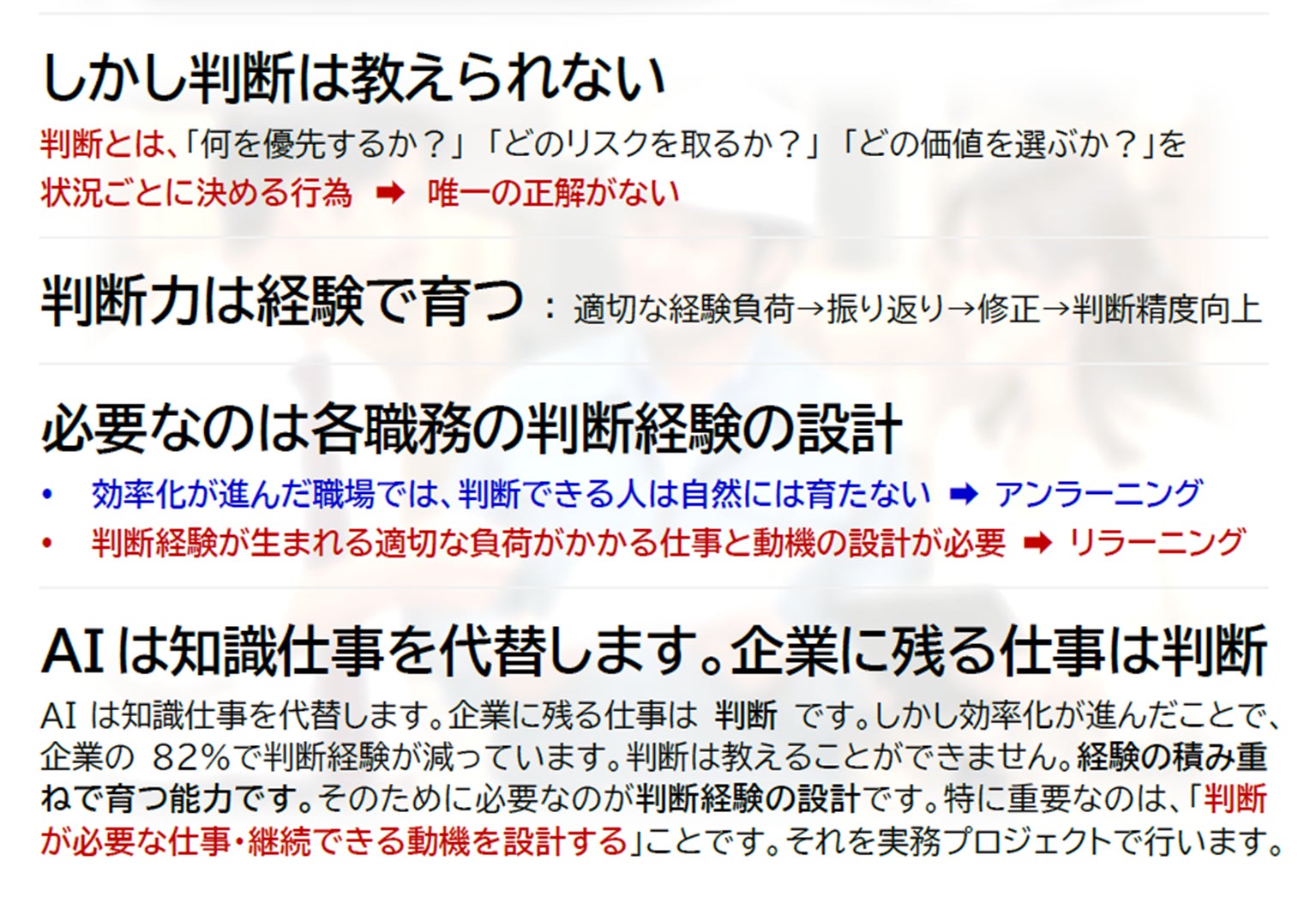 AIの普及によって、知識として教えることができる仕事は急速に自動化されつつあります。一方で企業では、業務効率化や標準化が進み、仕事の中から判断経験が減少しています。