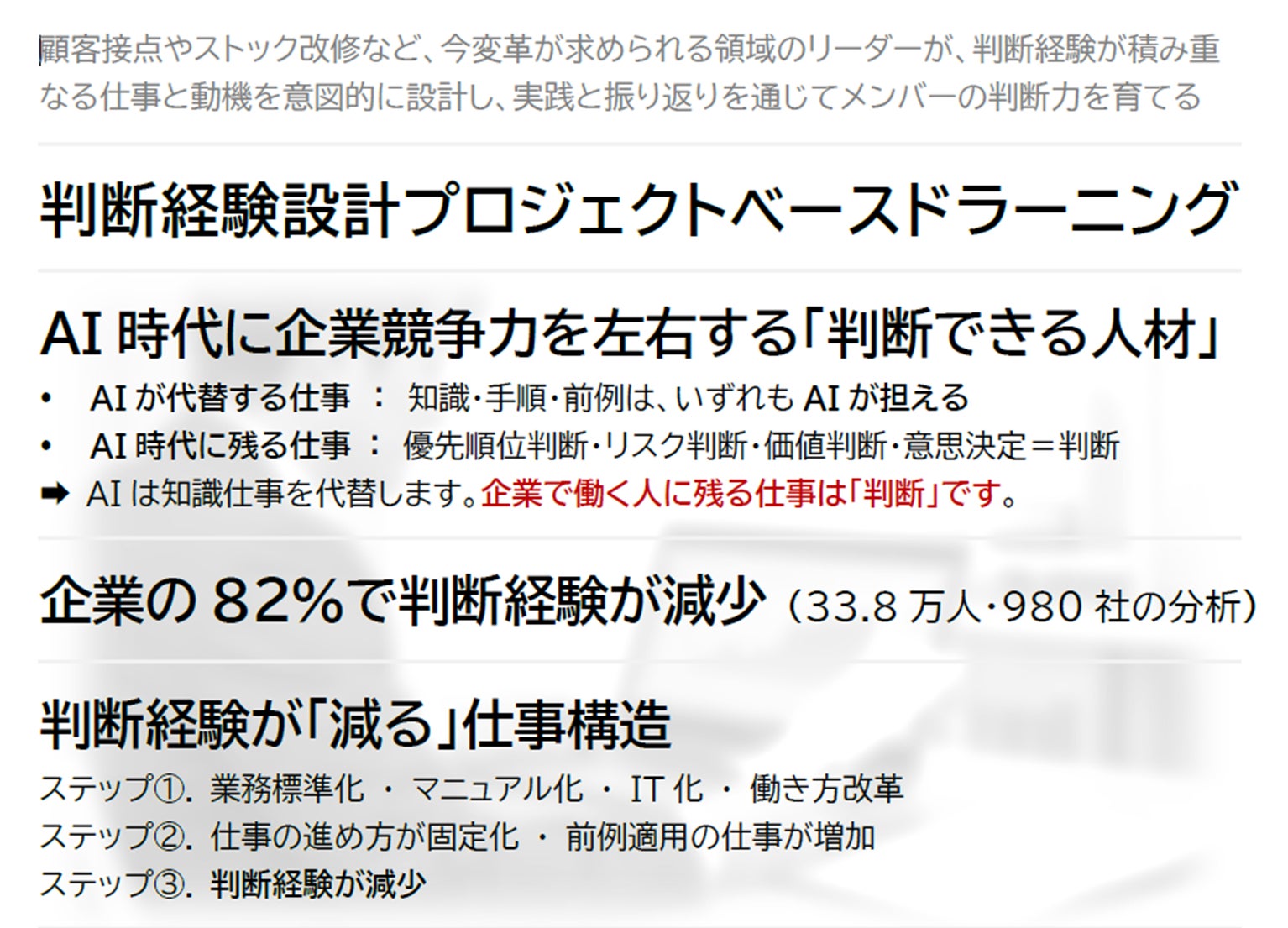 AIの普及によって「知識として教えられる仕事」は急速に自動化されています。しかし企業では、効率化と標準化が進んだ結果、仕事の中から判断経験が減少しています。