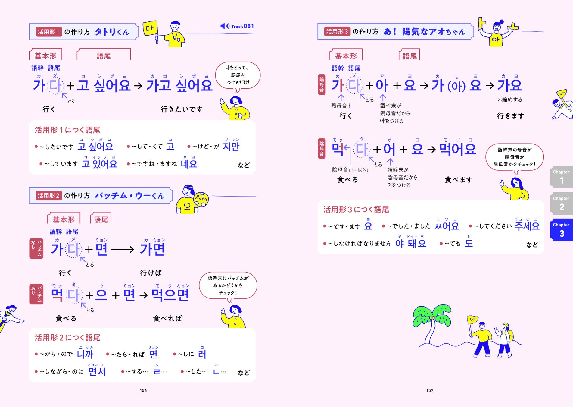 韓国語の活用を、本書ならではの3つの活用形に分けて解説しています。