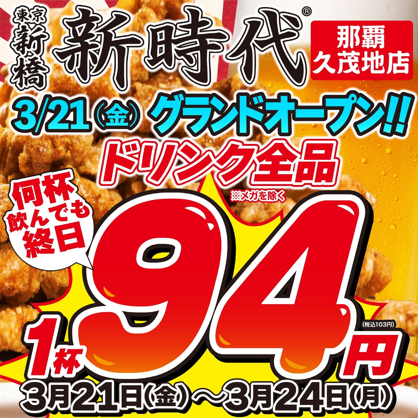 沖縄初上陸を祝しまして、3月21日(金)~3月24日(月)はメガ以外のドリンク全品、何杯飲んでも終日1杯94円(税込103円)のオープン記念イベントを開催いたします!