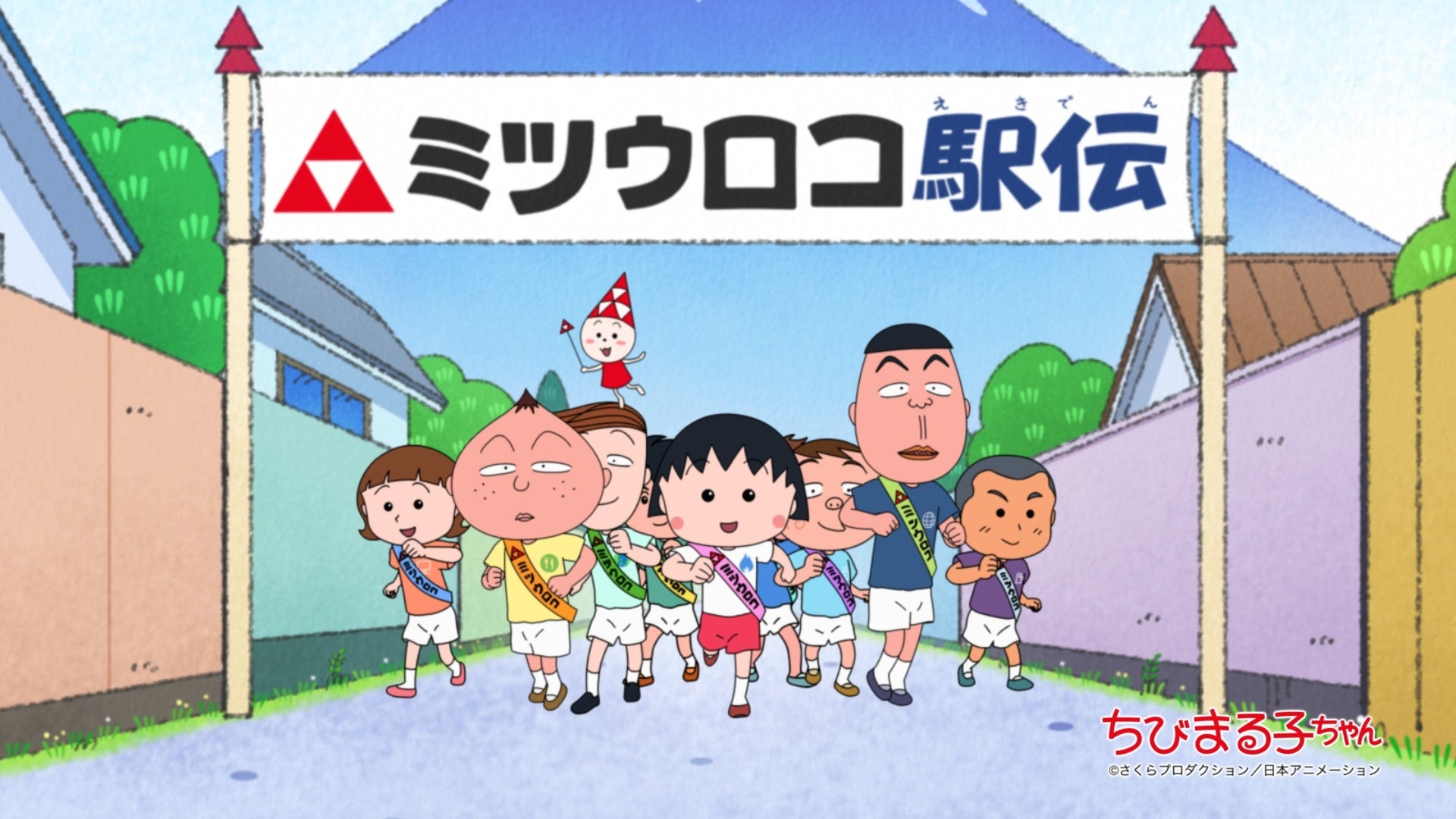 テーマは“駅伝”!ミツウロコ主催のこども駅伝大会でちびまる子ちゃんとクラスメイトたちがみんなで楽しく笑顔でたすきをつなぎます。