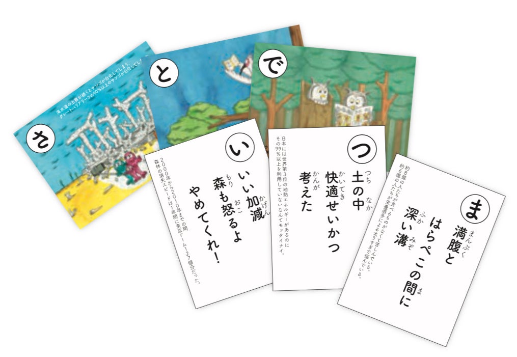 環境問題を分かりやすく伝えるためにかわいいイラストにユーモラスな標語を結びつけたかるた。