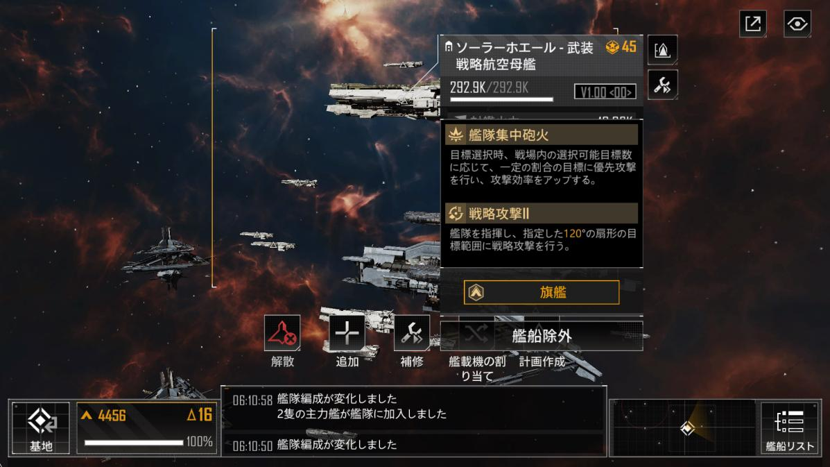 旗艦にすると他の艦船に持続的なバフ効果を提供できる艦船や、艦隊が特定のクエストを実行するのに役立つ特殊な戦略能力を提供するものもあります。例えばソーラーホエール - 武装戦略航空母艦を旗艦にすると、艦隊に遠距離攻撃能力を持たせることができます。ノマM470級 - 重量級揚陸艦の場合、攻撃を受けている敵軍を一定時間撤退不能にできます。