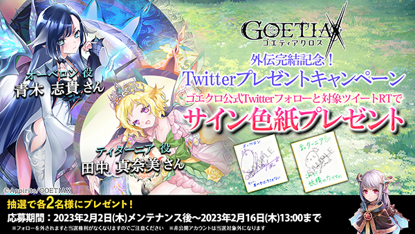 「聖晶翠姫ティターニア」を演じる田中真奈美さんと「蒼翔オーベロン」を演じる青木志貴さんの直筆サイン色紙を抽選でプレゼントします。
