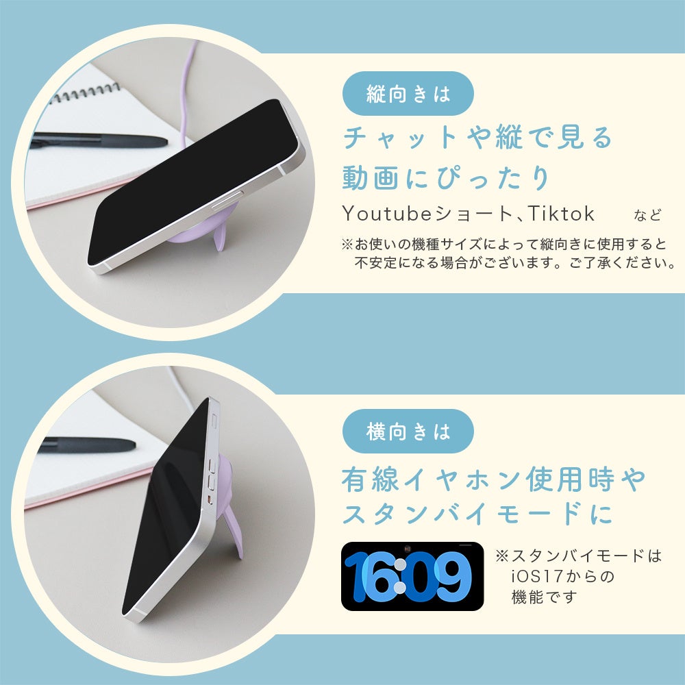 スマートフォンをタテ・ヨコにスタンドすることができるので、ワイヤレス充電をしながら、動画視聴、ゲーム、テレビ電話などができます。