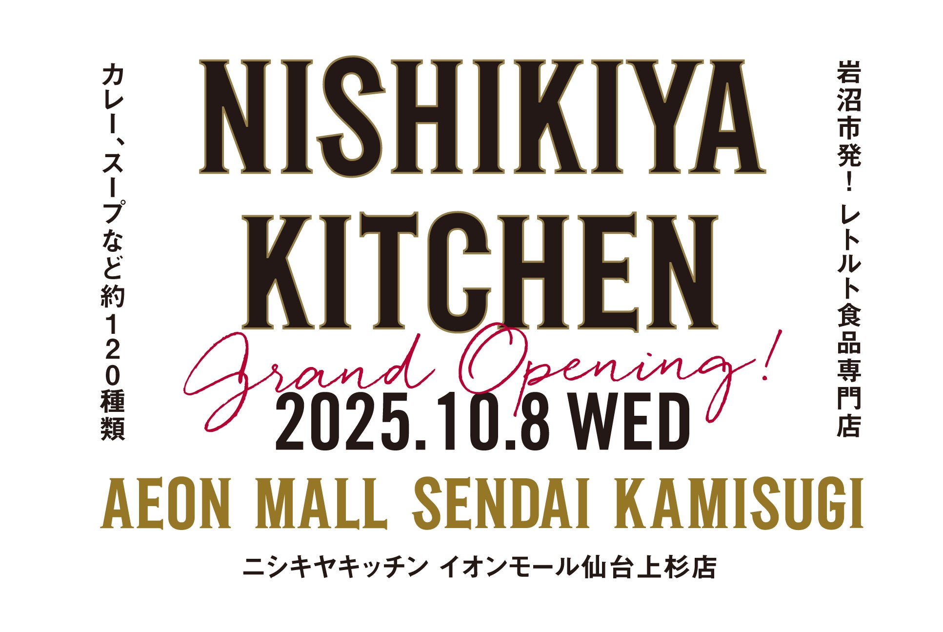 「世界の料理を『カンタン』に。」をコンセプトに掲げ、レトルトカレーを中心に販売するレトルト食品専門店NISHIKIYA KITCHEN(ニシキヤキッチン)(株式会社にしき食品 本社:宮城県岩沼市、代表取締役社長:菊池洋一)は、2025年10月8日(水)に「ニシキヤキッチン イオンモール仙台上杉店」がオープンします。それを記念し、10月8日(水)から10月13日(月・祝)までの6日間限定で「ニシキヤキッチンオープン記念祭」を開催します。イオンモール仙台上杉店では“カレーと学び”を店舗テーマに据え、ニシキヤキッチン史上初、お客さまの好みに合わせたスパイスを提案してブレンド体験ができる「スパイスカスタムブレンド」や、クラフト紙で作るオリジナル「カレー折り紙」、通販や店舗で配布している人気のこだわり冊子「キッチン」もプレゼントすることが決定。また、ここでしか買えないお得な「ランチバッグ付きオープン記念セット」をはじめ、お子さまとご来店いただいた際には、オリジナルデザイン風船をプレゼントします。オープン記念祭の期間中に限らず、店内には試食専用コーナーを常設しており、人気商品などの試食提供も行います。