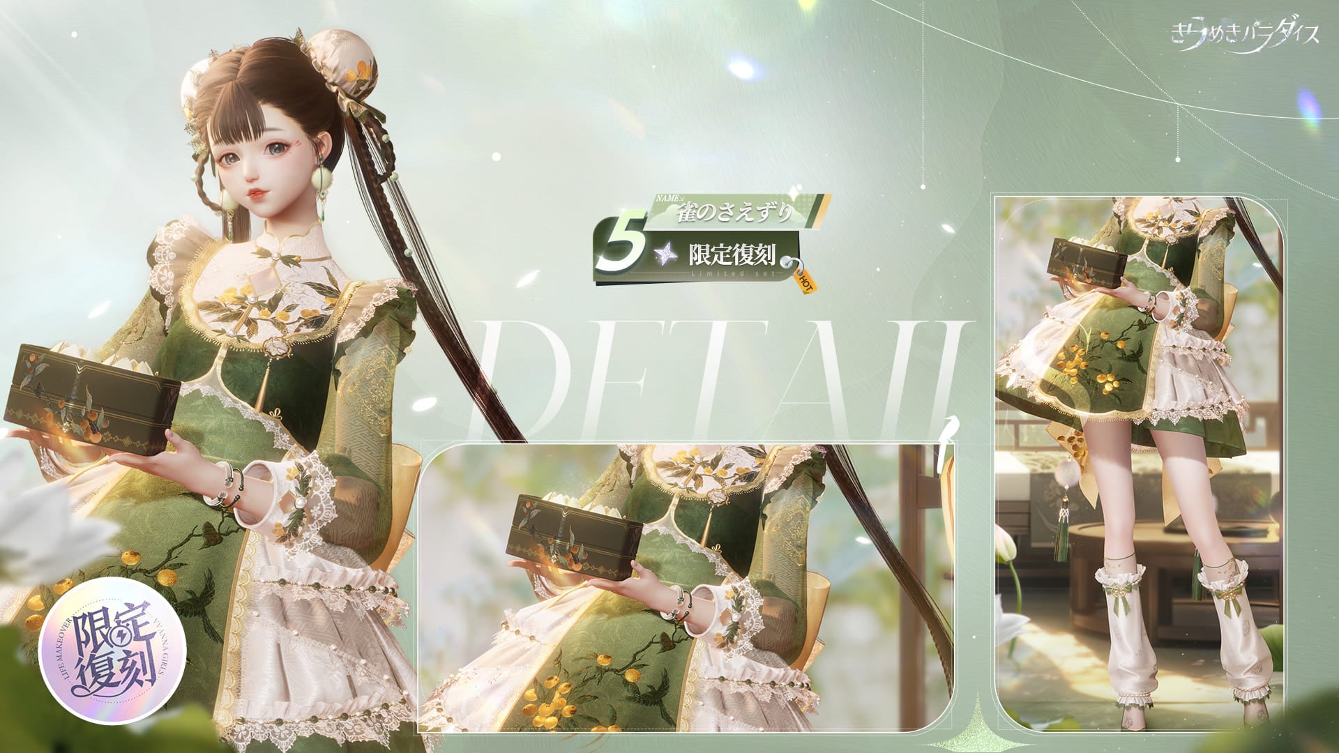 VVANNA STUDIOは、次世代ガールズドリームRPG『きらめきパラダイス~自由につくれる夢の世界へようこそ~』において、限定星6セットコーデ「暮夜の支配者」、限定星5セットコーデ「雀のさえずり」が復刻することをお知らせします。さらにファッション対決新シーズンスタートで、無料星6セット獲得チャンス!この機会をぜひお見逃しなく!