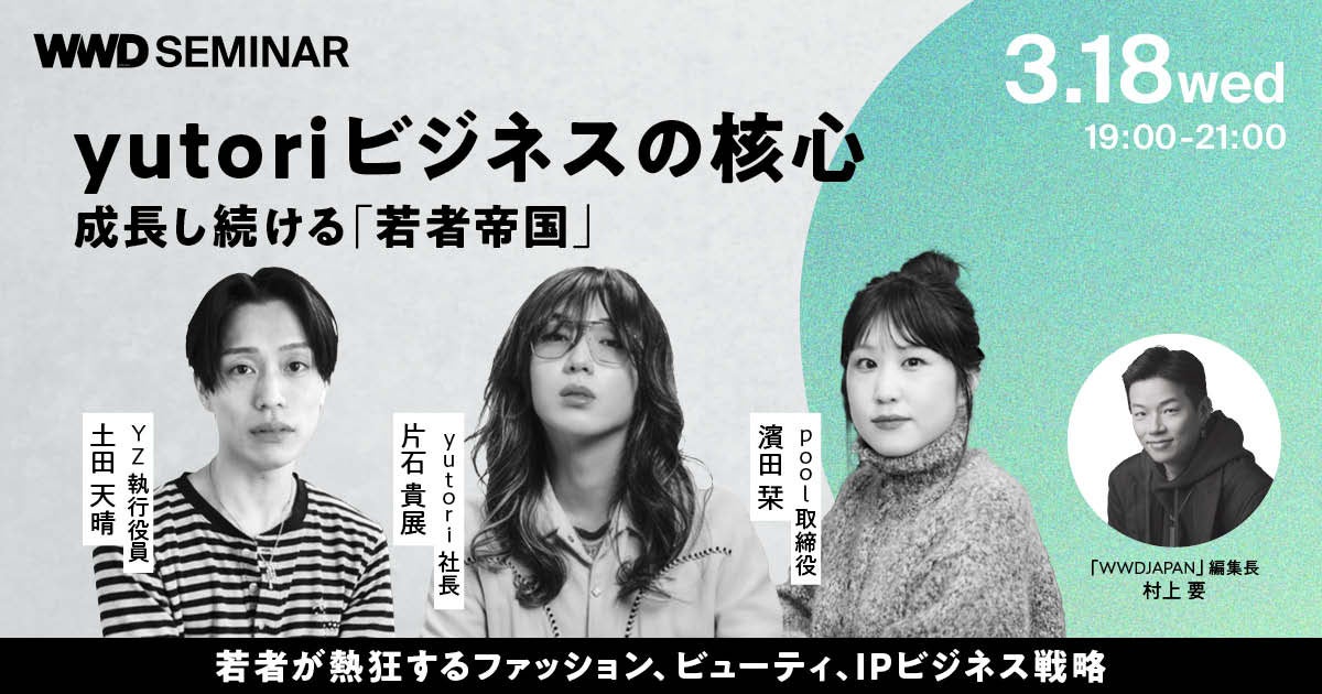 そこで今回のセミナーでは、yutoriのファッションとビューティ、IPビジネスを大解剖。片石社長をはじめ、グループの幹部社員が続々登壇し、若い世代の熱狂を集めるファッションとビューティ、IPビジネスの全貌と野望に迫ります。