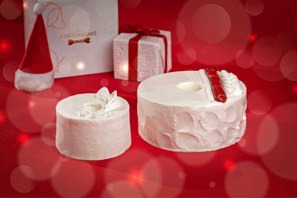 リニューアルした犬用シフォンケーキ『Shiro』と、ニットをイメージしたデザインの『CHIFFON de Noel』のセット。