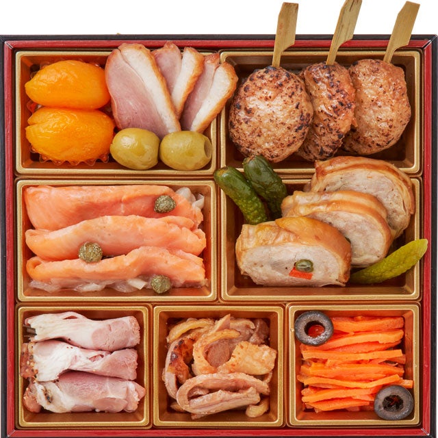 杏子煮×2、合鴨スモーク×3、スタフドオリーブ×2、鶏つくね串×3、オニオンマリネ50g、スモークサーモントラウト・ケッパー×3、小胡瓜×3、若鶏の三色巻×3、アンデスポーク×3、親鶏のポン酢仕立て30g、キャロットラペ30g、ライプオリーブ×2