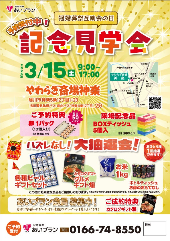 一般社団法人 全国冠婚葬祭互助会が定めた「冠婚葬祭互助会の日(3/15)」を記念して、全国の加盟各社で一斉にコラボイベントが開催されています。株式会社あいプランではこのコラボレーション企画として、北海道札幌市、旭川市の斎場で特別な見学会を行います。