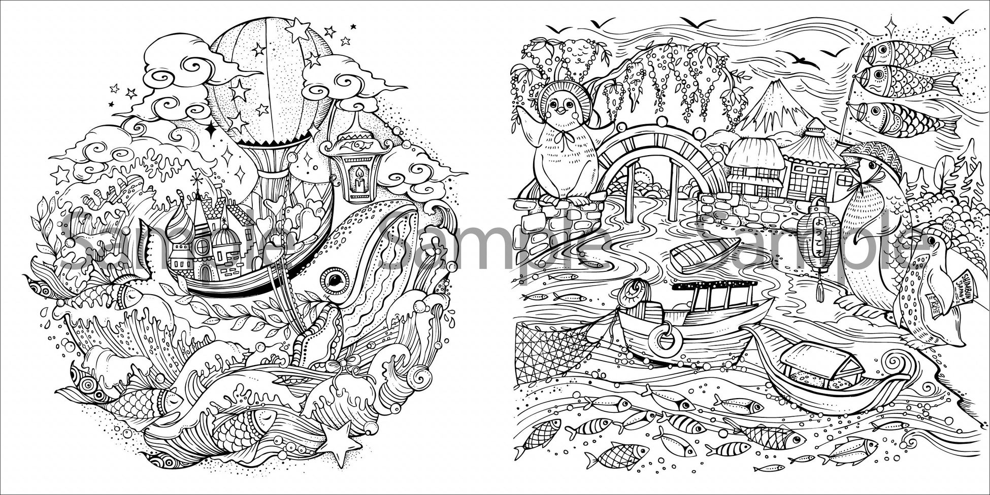 本書はアジア大陸への旅塗り絵。キャラバンが行くゴビ砂漠、伝統的な模様が魅力的な中国、富士山の絶景が印象的な日本など、彩色が進むたびにエキゾチックな国々の風景が美しく浮かびあがります。- イメージ
