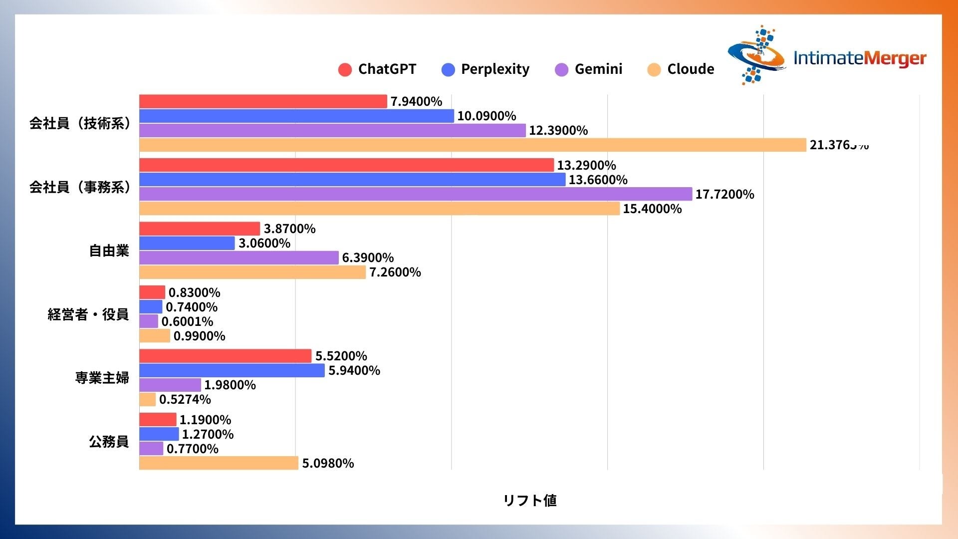 国内最大級のパブリックDMPを提供するデータプラットフォームカンパニー、株式会社インティメート・マージャー(本社:東京都港区、代表取締役社長:簗島 亮次、以下:当社)は、生成AIの急速な普及により、LLMを活用した新たな情報収集・意思決定手法の広がりを受け、各生成AI利用者のデータに着目した調査を実施しました。