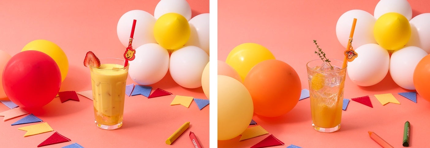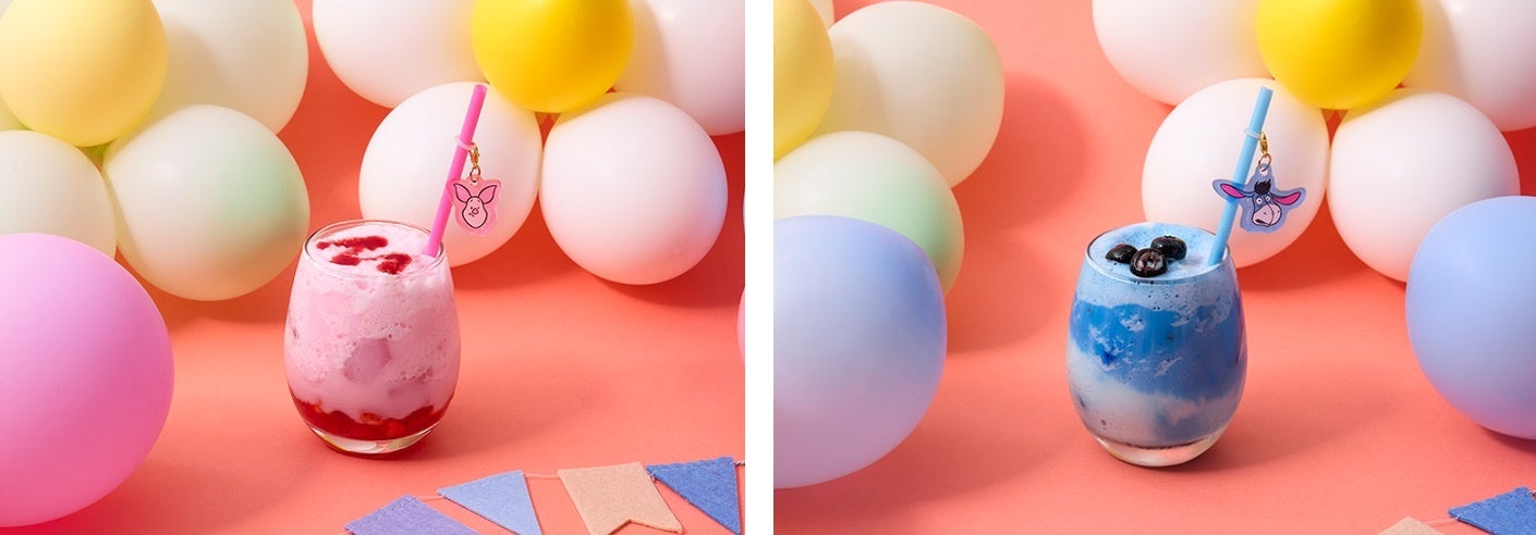 <プーさん>はちみつゼリーミルク/<ティガー>オレンジスカッシュ/<ピグレット>いちごヨーグルトスムージー/<イーヨー>ブルーベリーヨーグルトスムージー/ホットハニーティー
