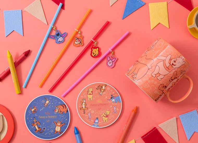 また、プーさんと仲間たちのFUNNYなフェイスが楽しいオリジナルアートを使用したシリーズや、『ティガー・ムービー/プーさんの贈りもの』をモチーフにしたアートを使用したシリーズなどの、カフェオリジナルグッズやスーベニア、特典が登場します。