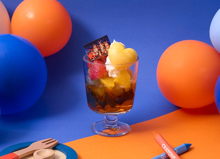 『ティガー・ムービー/プーさんの贈りもの』のワンシーンを切り取ったピックとハート型のロケットをイメージしたモナカがのったパフェです。オレンジ風味のゼリーと竹炭ヨーグルトでティガーになった気分♪
