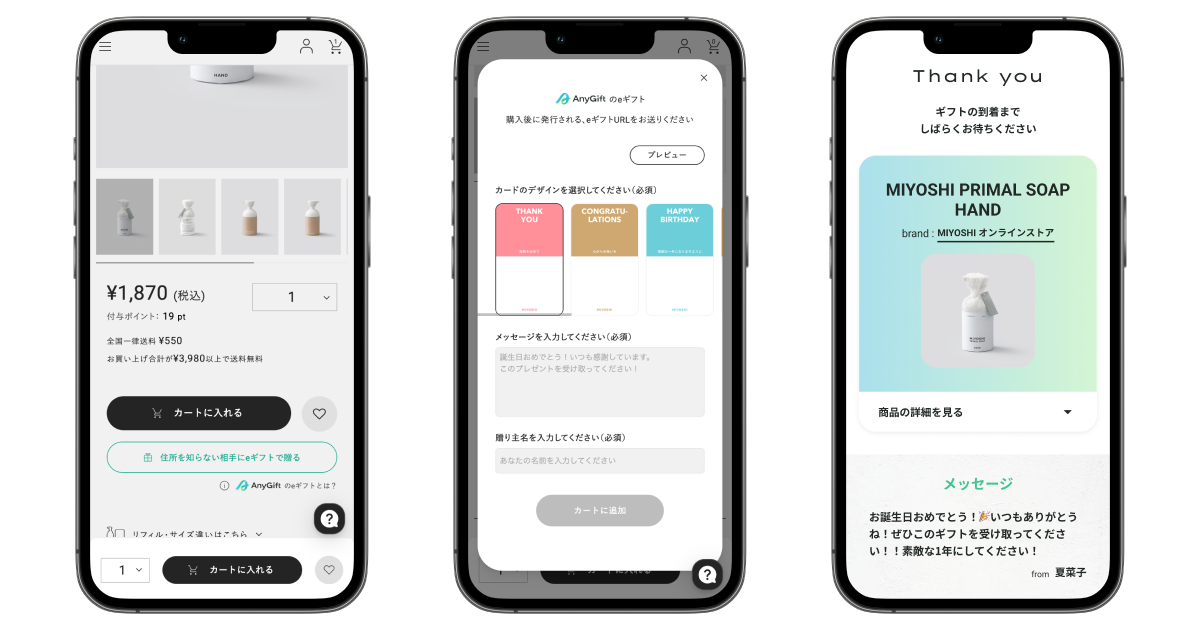 そこでこの度、お客様にもっと気軽にMIYOSHIオンラインストアの商品をプレゼントとしてご利用いただきたいという思いから、AnyGiftの導入を決定いたしました。