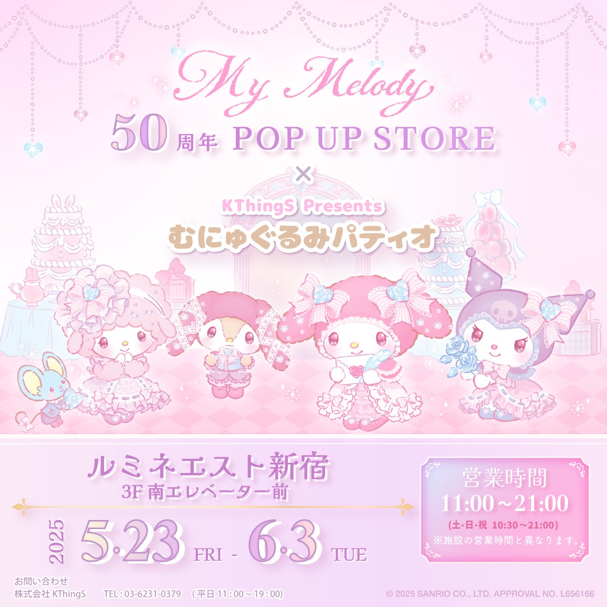 さまざまなキャラクターグッズを企画・販売している株式会社KThingS(東京都中央区)はルミネエスト新宿 3F 南エレベーター前にて『My Melody 50周年 POP UP STORE × むにゅぐるみパティオ』を2025年5月23日(金)~2025年6月3日(火)の期間で開催いたします。