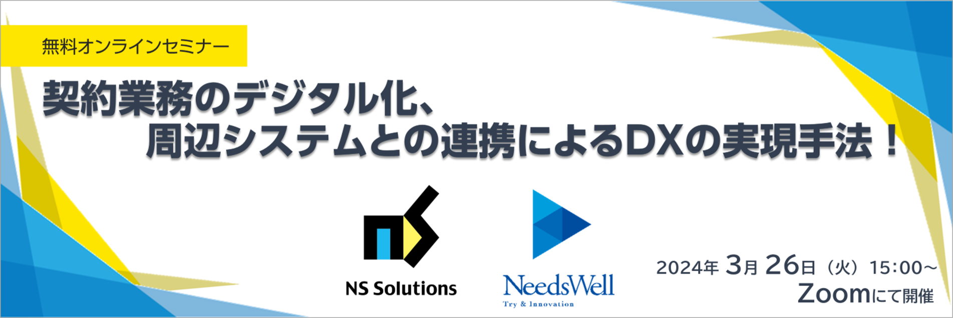 内容 | 1)DXを推進するための3つのステップ 株式会社ニーズウェル 2)契約業務のデジタル化を実現する電子契約サービス(CONTRACTHUB) 日鉄ソリューションズ株式会社 3)ITリエンジニアリングサービス「契約業務」による業務全体の自動化・効率化の実現 株式会社ニーズウェル |