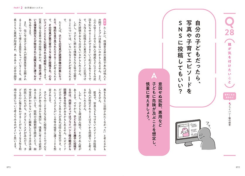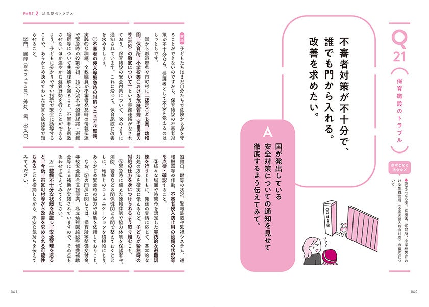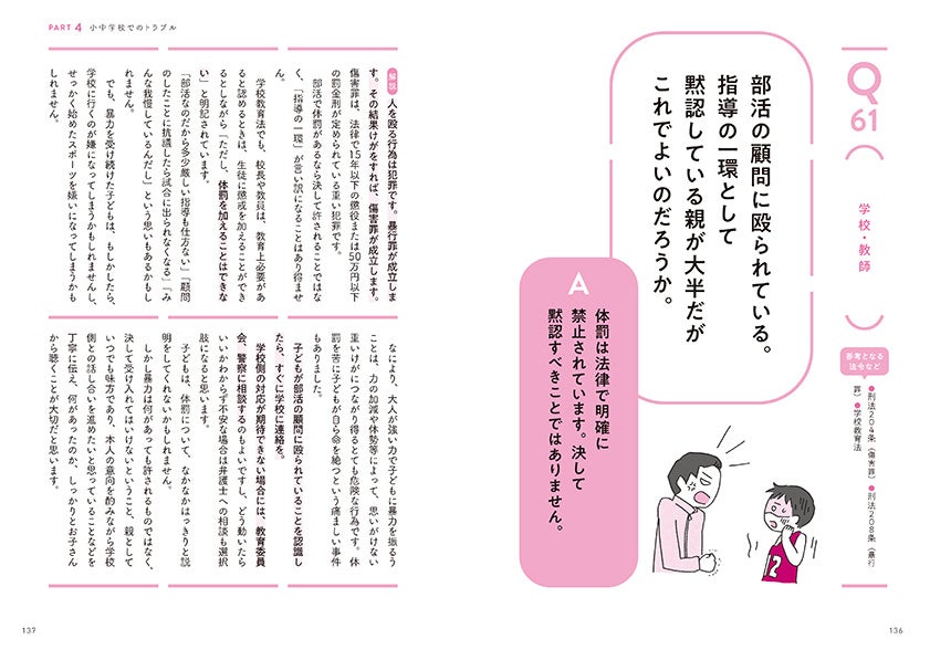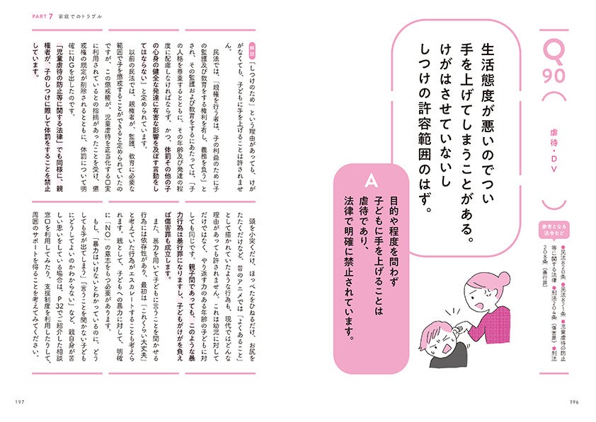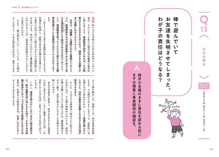 『子育て六法』では、妊娠して親になった瞬間から見舞われるトラブルから、乳児期にやってしまいがちなこと、幼児期の思わぬ過失、保育施設での事故、小中学校での暴力やいじめなど、妊娠中から思春期までのあらゆる事例と、第三者としてトラブルを目撃してしまった場合の対処法などを解説しています。