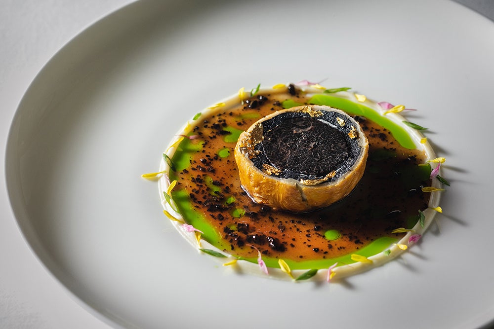 歴代のフランス国王の戴冠式が行われていた、シャンパーニュ地方・ランスの「ノートルダム大聖堂」。シャンパーニュ地方をこよなく愛するフィリップ・ミル シェフが、その戴冠式からインスピレーションを受け、王冠に見立てたクリスマスのスペシャルメニューを考案。香り高い黒トリュフをフイユテ(パイ)で包み焼き上げ、トリュフソースと共にお楽しみいただく贅沢な一皿です。